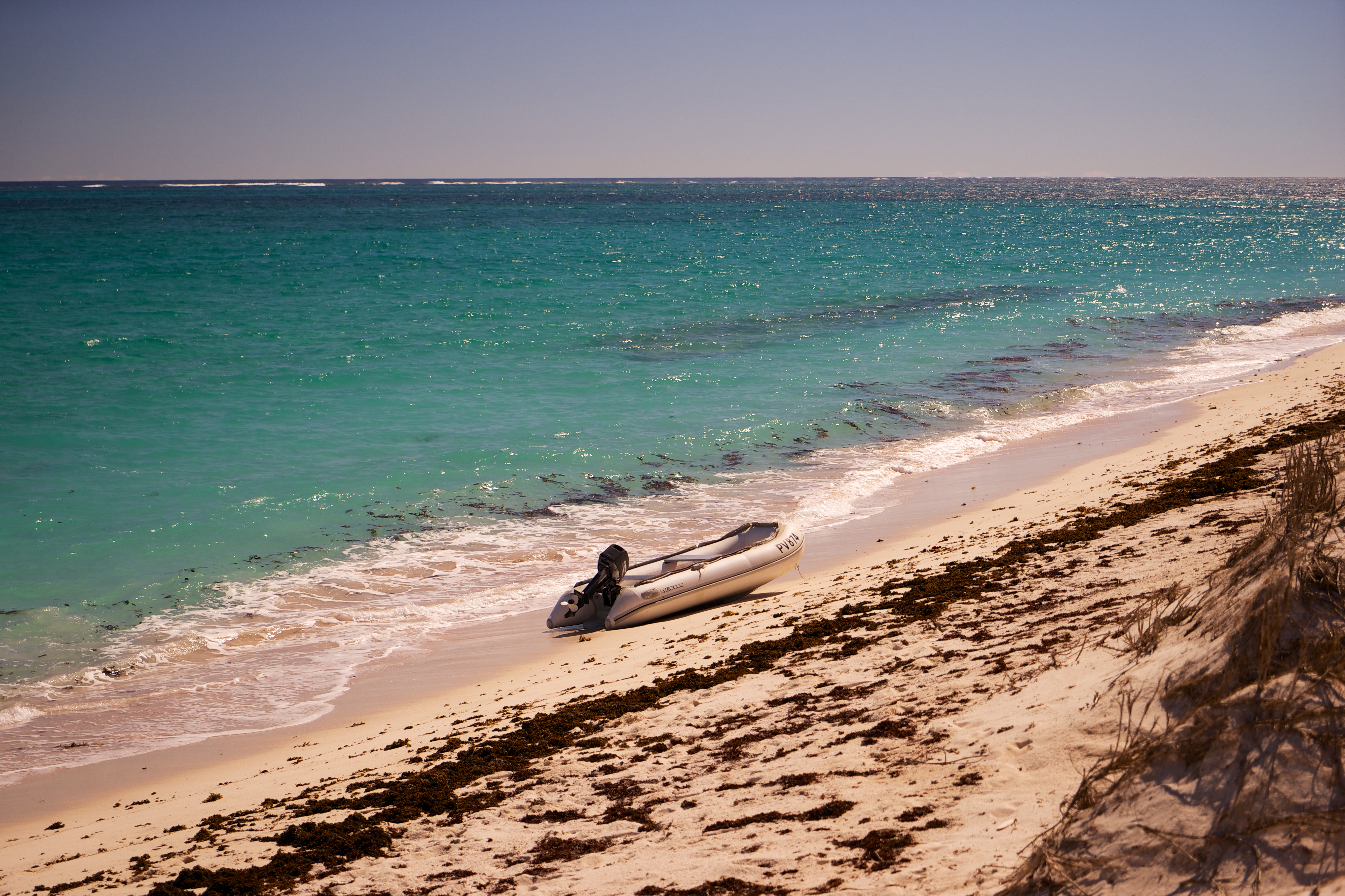 Our little boat on the edge of the water at our campsite. The dark areas are coral and weed and full of reef fish.